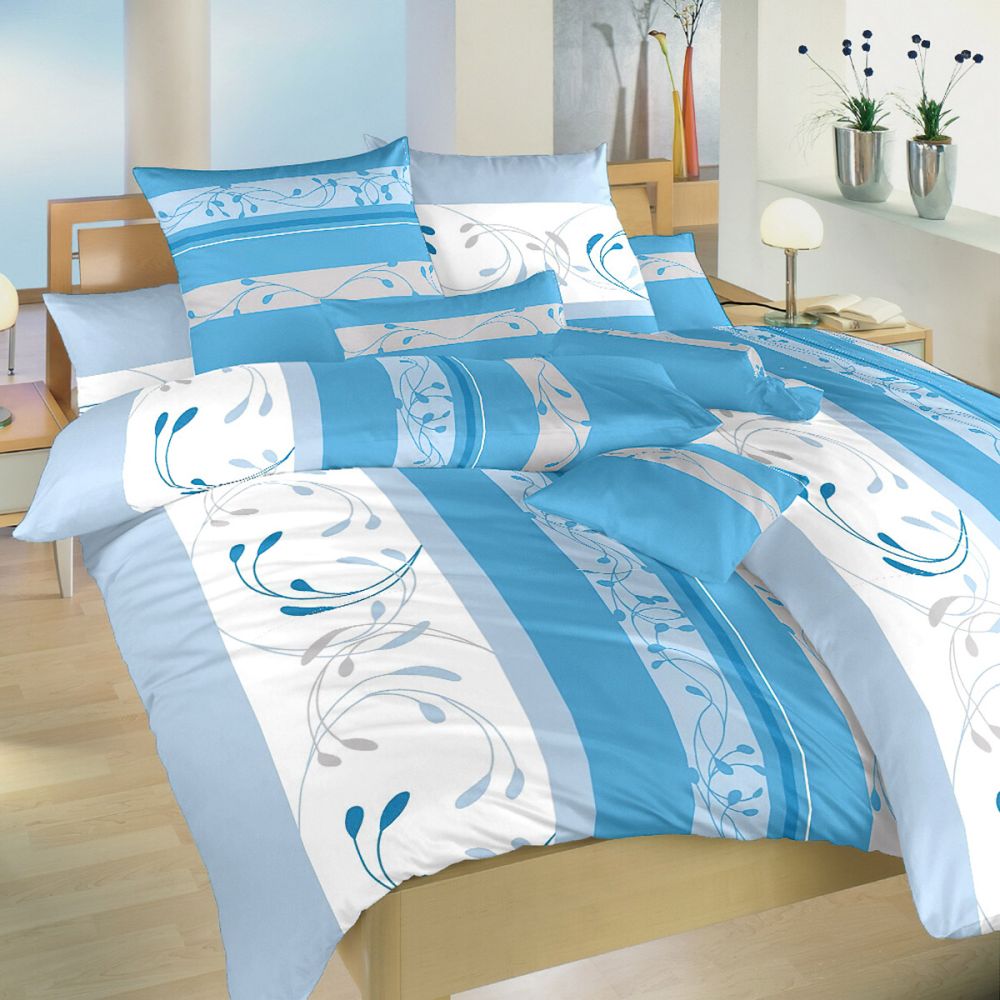 Krepové povlečení se vzorem pruhů v kombinaci s lístečky v modrých barvách. Vrchní i spodní strana přikrývky je stejná. Souprava je vyrobena ze 100% bavlny a obsahuje jeden povlak na přikrývku 140 x 200 cm a jeden povlak na polštář 70 x 90 cm. Zapínání na zip.