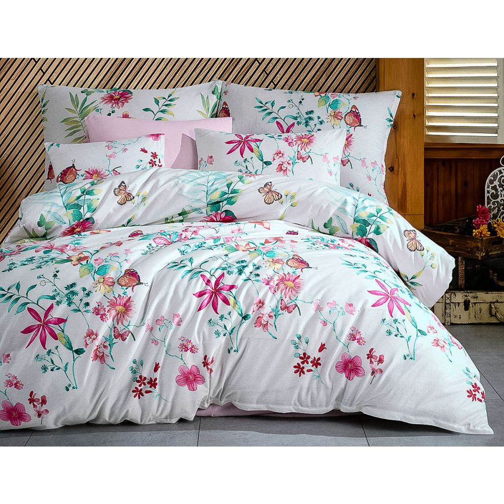 Bavlněné povlečení za dostupnou cenu se vzorem růžových a tyrkysových na bílém podkladu. Povlak na přikrývku má vzor z obou stran stejný. Povlak na polštář má stejný vzor. Souprava je vyrobena ze 100% bavlny a obsahuje jeden povlak na přikrývku 140 x 200 cm a jeden povlak na polštář 70 x 90 cm. Zapínání na zip.