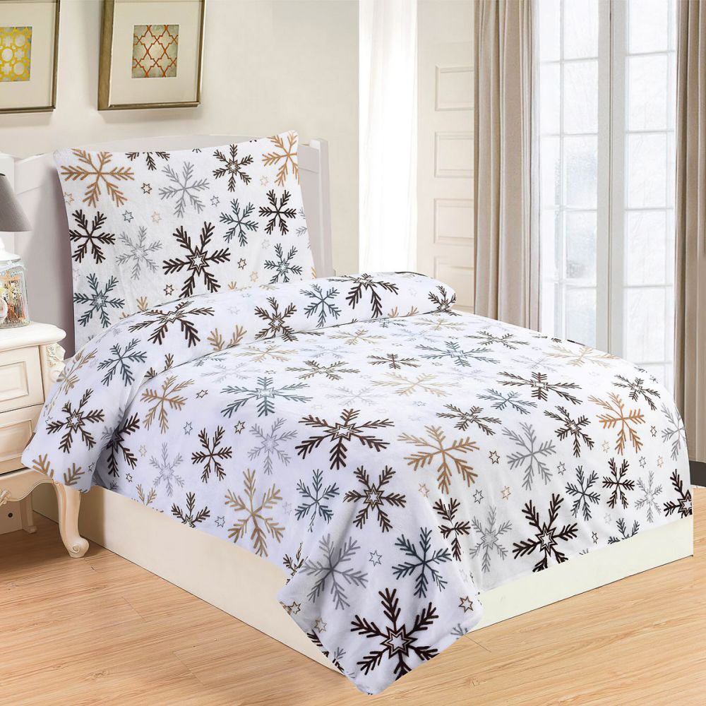 Povlečení VLOČKA HNĚDÁ, mikroflanel, sněhové vločky na bílé, 140x200cm + 70x90cm