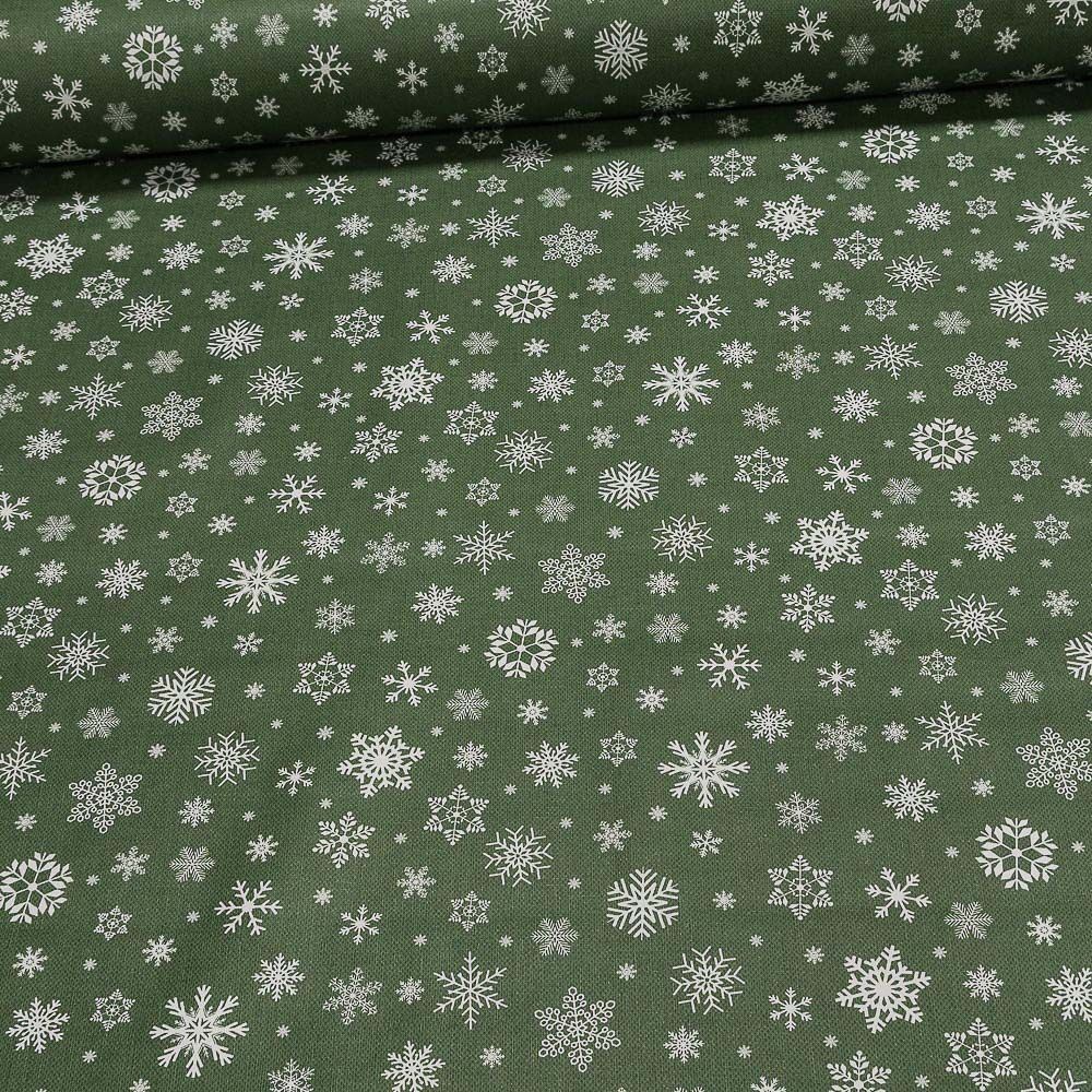Omyvatelná PVC ubrusovina s podkladem z netkané textilie, se vzorem bílých sněhových vloček na zeleném pozadí. Ubrus je dostupný v metráži o šířce 140 cm s hladkým povrchem.