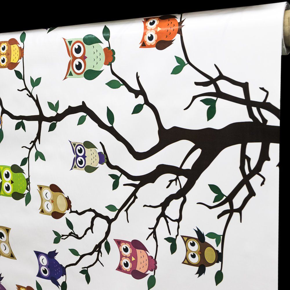 Omyvatelná PVC ubrusovina s podkladem z netkané textilie a se vzorem barevných sov na větvích stromu na bílém podkladu s hladkým povrchem. Ubrus je dostupný v metráži o šířce 140cm.