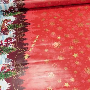 Omyvatelná PVC ubrusovina s podkladem z netkané textilie s vánočním vzorem santy v borduře po stranách na bílém podkladu s hladkým povrchem. Ubrus je dostupný v metráži o šířce 140cm.